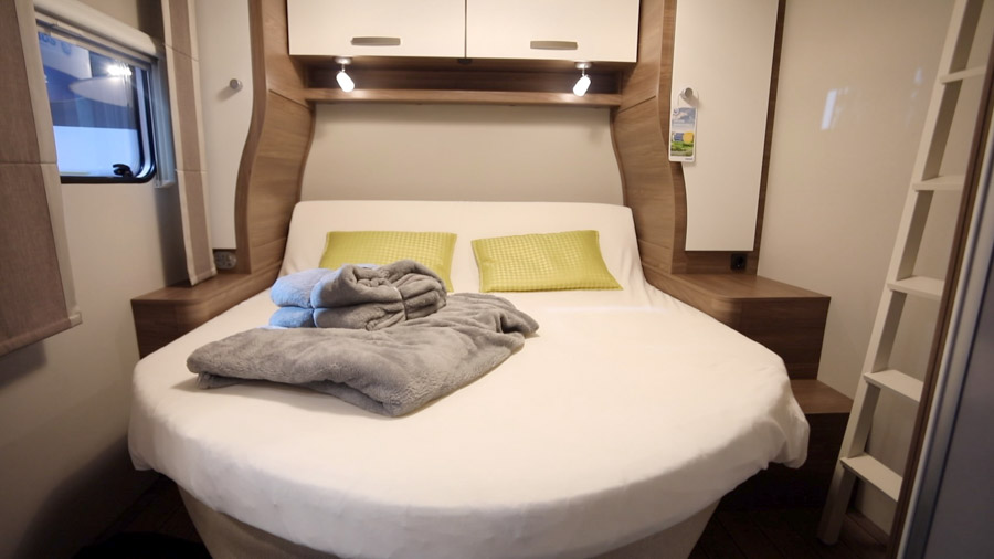 Bagerst er den indrettet med en stor fritstående dobbeltseng. Der er desuden god opbevaringsplads i soveafdelingen.