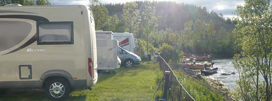 Vejret har været udmærket, så vi har nydt at kunne sidde under den fastmonterede markise og kigge ud på alle fiskerne, der står på bredden af den elv, der flyder lige fem meter bag vores vogn. Det siges at være et godt sted at fange laks.