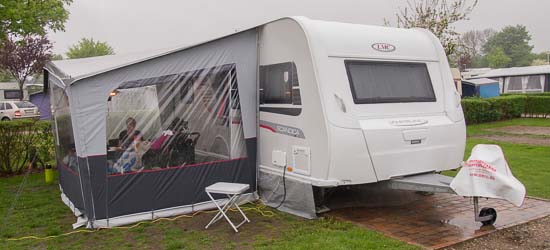 Man kan godt hygge sig selvom det øs-regner. Vi har en Isabella Transit på vognen, og med sider og front holder den al regnvand ude.