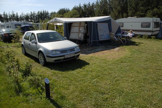 Det tog os samlet små to timer at slå Camp-let’en op første gang. Vi havde fået at vide at det kan gøres på cirka en time, men dels havde vi jo ikke den samme rutine endnu, og dels skulle vi havde solsejl på, hvilket vi ikke havde set demonstreret. Til gengæld havde vi på forhånd fravalgt sidekabinen da vi jo kun var tre, og ikke havde mere udstyr med, end det kunne være i Golf’en og ovenpå Camp-let’en, så den var der ikke behov for.